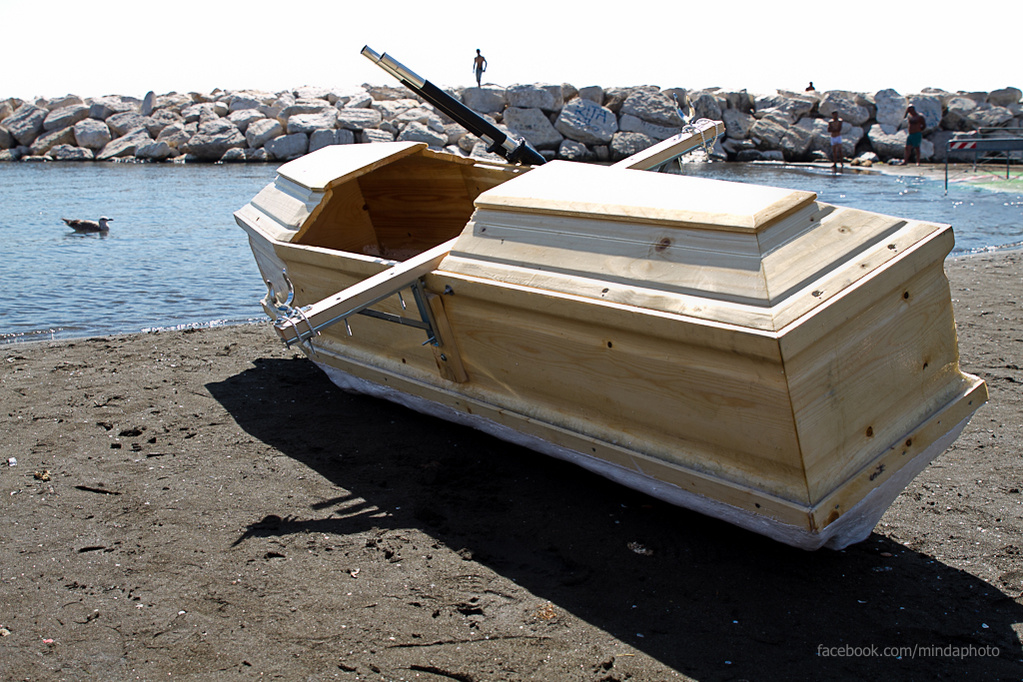 La bara, originariamente simbolo di stasi della condizione esistenziale umana, da oggetto dada anti-teocratico giunge a diventare barca. In una ricerca di valori immutabili pur nella loro mutabilità, la bar(c)a è coprotagonista di un’azione performativa in cui si abbandona quasi il carattere assolutamente gestuale e si guadagna un lavoro più che mai incentrato sul corpo: è un viaggio che comincia e prosegue in quel mare che non bagna Napoli ma che dalla città si lascia vivere, che è fatto di acqua e sale, che accoglie la vita come un grembo materno. Che sia placenta o piscio, latte materno o sperma è la stessa cosa.